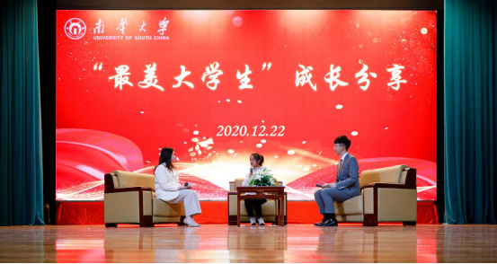 在“最美大学生”成长分享环节,计算机院2018级本科生黄程、语言文学学院2018级研究生罗曙、衡阳医学院2018级本科生严露、核科学技术学院2018级研究生刘宏铭、机械工程学院2018级本科生夏昊、第二临床学院2020级研究生周煜中等六位“最美大学生”获奖者现场分享了他们的成长经历。他们中有参军入伍的战士、山区支教的老师、乐于助人的个人、专注科研的学霸、湖北抗疫的志愿者等,他们是时代的守望者,是温暖的讲述人,他们象征着南华的勃勃生机,激励着南华学子不负青春、不负韶华、不负时代。