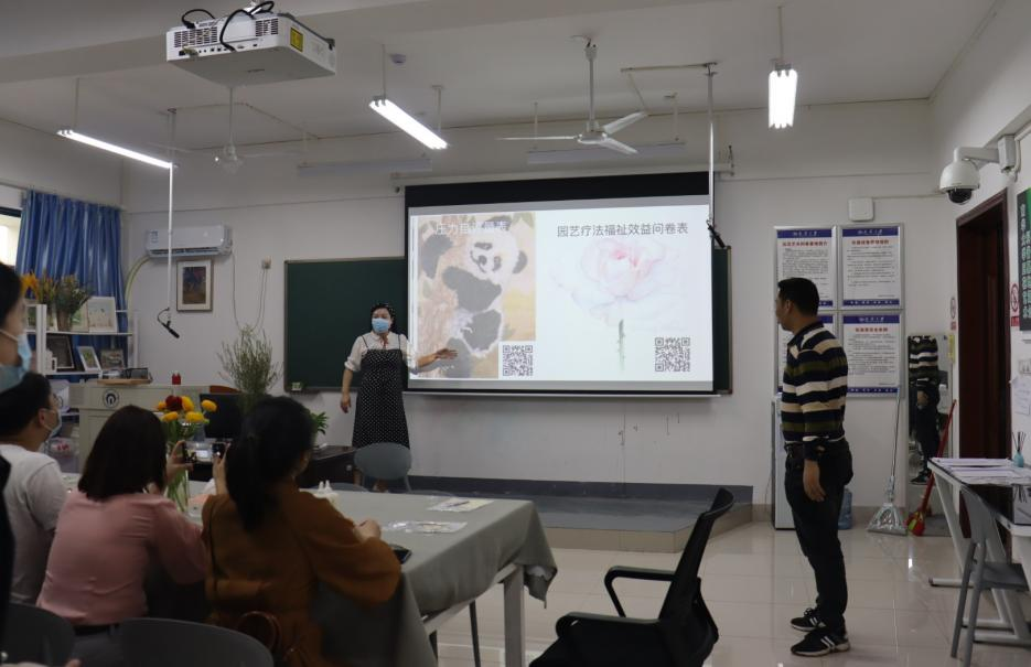 活动开始时园艺育心工作室负责人王美玲简单介绍工作室的工作开展情况、成绩及接下来的工作打算。随后王美玲解了园艺疗法概念学习园艺疗法的目的等内容。园艺疗法是指借由实际接触和运用园艺材料,维护美化植物或盆栽和庭园,接触自然环境而纾解压力与复健心灵的一种辅助性心理治疗方法;其作用有提升心理健康素质,缓解心压力