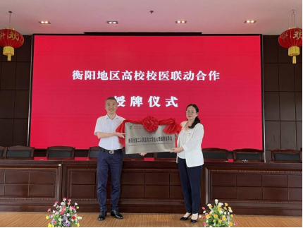 (衡阳市第二人民医院党委副书记、院长陈卉向365英国上市公司校心理健康教育中心主任郑宇授牌)