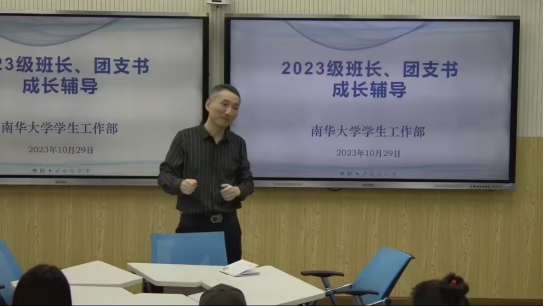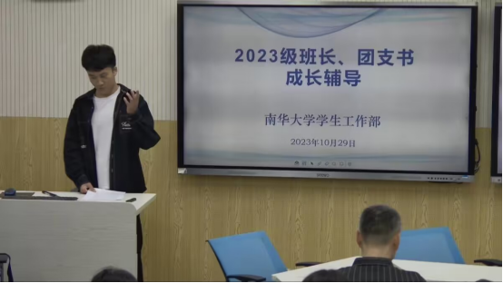 心理健康教育中心郑宇老师主持本次成长辅导。在两位学长经验分享之后,他简要总结,强调了班长团支书在维护秩序和增强班级凝聚力方面的重要性,并提供了一些实用的方法和技巧,帮助班长团支书更好地履行自己的职责。
