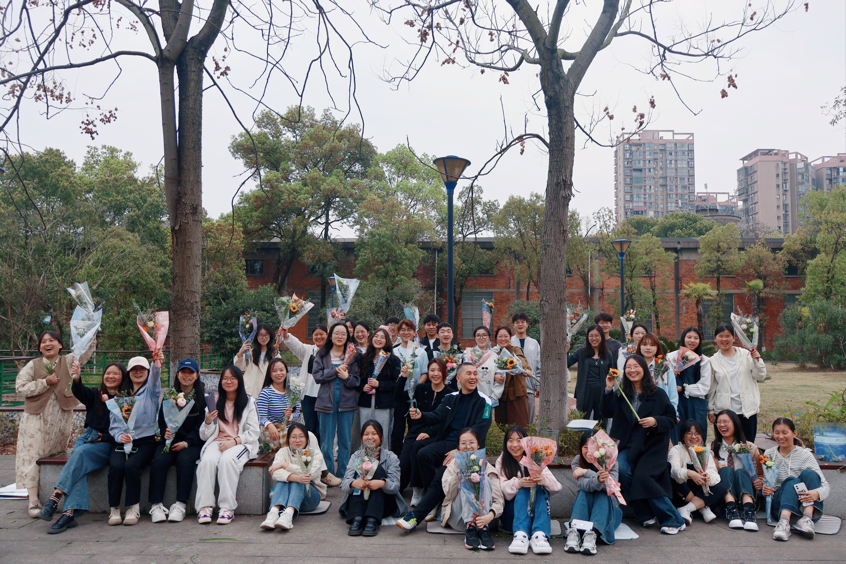 了解相关制作技巧后,同学们迫不及待地开启花束创作。玫瑰、洋甘菊、康乃馨等花卉在同学们手中灵活流转,花香愈发浓郁,同学们精心搭配,细致捆扎,一束束风格独特、富含巧思的花束很快便呈现在眼前。花束制作完成后,同学们依次分享了自己的作品以及创作心得。
