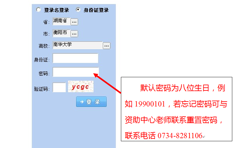 请选择学校信息“湖南省——衡阳市——365英国上市公司”,录入贷款人身份证号,密码为身份证上8位出生日期,如19880214。