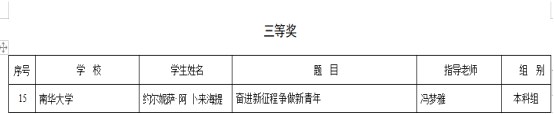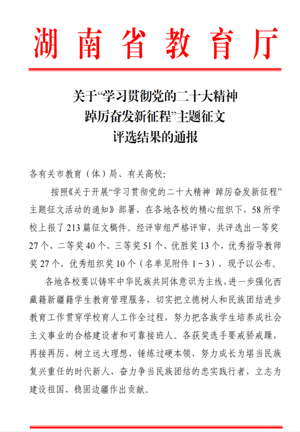 2022年11月,学生工作部根据省教育厅下发的《关于开展2022年在湘就读西藏新疆籍少数民族学生“贯彻党的二十大精神 踔厉奋发新征程”主题征文活动》通知要求,在校内组织了初赛,共收到19篇作品,经评审、指导最终推送5名学生的优秀作品参与省赛。
