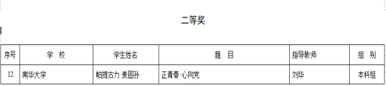 近日,省教育厅公布了“学习贯彻党的二十大精神踔厉奋发新征程”主题征文评选结果,在此次评选中我校3名新疆籍学子和1名指导老师荣获佳绩。其中,数理学院2019级学生凯撒尔·买买提撰写的“践行卫国誓言,勇担时代使命”荣获本科组一等奖;土木工程学院2019级学生帕提古丽·麦图孙撰写的“正青春·心向党”荣获本科组二等奖;土木工程学院2021级约尔妮萨·阿卜来海提撰写的“奋进新时代,争做新青年”荣获本科组三等奖。此外,我校数理学院陈小兰老师荣获优秀指导老师奖。