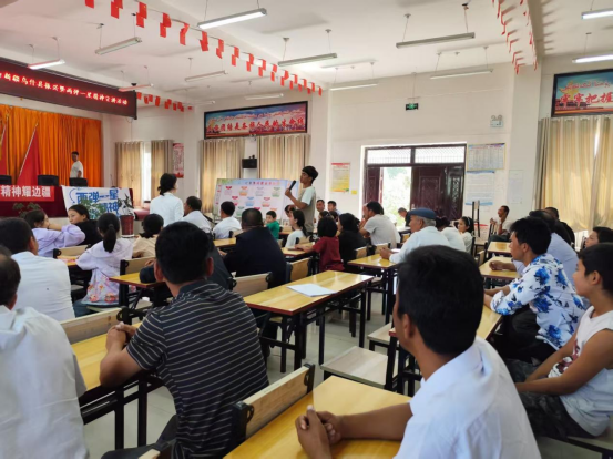 “科学家们为什么要去戈壁滩?”互动环节中,高一学生穆热迪力·图尔迪用流利的普通话高声作答:“为了祖国更强大!”话音刚落,现场便响起热烈掌声。活动设置的“核能知识竞赛”“普通话挑战”等环节,更是点燃了全场参与热情——孩子们争相举手抢答,家长们不时轻声补充,亲子间的默契配合与眼里的光,让“两弹一星”的精神火种在欢声笑语中悄然传递。阿恰塔格乡布干村书记对此深有感触:“这场活动既推广了普通话,更让爱国的种子在孩子们心中深深扎下了根。”