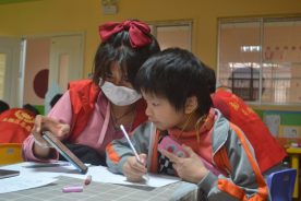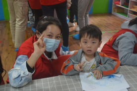 走进教室,迎接志愿者的是孩子们天真又期盼的笑脸。大中小班的孩子们与志愿者们进行绘画,叠纸,跳舞等温馨的互动,幼儿园里处处回荡着孩子们的欢声笑语。活动进行过程中,志愿者们耐心的询问孩子们的需求,认真倾听他们讲话。并不时给孩子们分发自己所准备的糖果等小礼物,气氛十分活跃。幼儿园园长以及老师们也对志愿者的到来表示了热烈的欢迎以及对活动的肯定,她们说:“这既弘扬了大学生反哺社会的美好品德,又有利于加强孩子们与外界的交流。”同时她们表示,在社会各界的关爱下,“聆音儿童”将会健康快乐地成长。