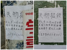 2020年12月26日中午,土木工程学院给排水科学与工程专业1701班殷文同学在北校求是园三栋旁边斜坡路拾得现金385元(现金裹在一起掉在地上),拾得现金后他一直在原地等待失主。等待许久失主没来,于是他返回宿舍写了3张失物招领,并张贴于丢失处电线杆以及斜坡上下处的电箱上,同时将失物招领信息上传到党队失物招领群等待失主的电话。等待几日仍未找到失主,殷文同学并未放弃,于12月31日联系辅导员贺淑珍老师寻求解决办法,希望能尽快找到失主。