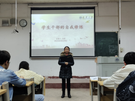 培训围绕担任学生干部的目的、目标,学生干部队伍的现状问题,学生干部应有的四种意识,自我修炼的三种方法等方面展开。马军指出,今年是建党一百周年,广大学生干部要在深入学习党史中,深刻领悟马克思主义是如何深刻改变中国、改变世界的,深刻认识中国共产党为什么“能",马克思主义为什么“行”,中国特色社会主义为什么“好”,牢牢把握个人能力和才干锻炼的重要机会。马军表示,学生干部要不断通过强化自我修炼,加强实践锻炼,进行自我反思努力提升综合素养。她重点分析了当前学生干部群体中存在的突出问题及其根源,并希望学生干部从调研分析法、形象树立法、制度约定法等三个方面努力进行自我修炼。她要求,学生干部要进一步配合学院做好管理工作,充分发挥模范带头作用、核心骨干作用和桥梁纽带作用,并希望学生干部在今后的工作中增强大局意识、服从意识、倾听意识、反馈意识,鼓励大家争当新时代优秀学生干部,做到在工作中提高自己、服务同学、奉献学院。