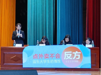 主席简短的开场之后,正方一辩开篇立论,指出点外卖会形成一种舒适圈,从而滋生大学生的惰性,陈词精辟,立论有据。随后,反方从产生惰性的原因出发,论证了点外卖与惰性的产生并无直接的联系,思维清晰,逻辑严密。针对对方的立论,双方都进行了激烈的攻辩和对辩,精彩的陈述和反击博得全场喝彩,现场气氛热烈。到了自由辩论环节,比赛达到最高潮。辩手们你来我往、针锋相对、据理力争、口若悬河。在最后的总结陈词中,双方针对对方逻辑上的漏洞逐一回击,为赢得比赛做最后的努力。