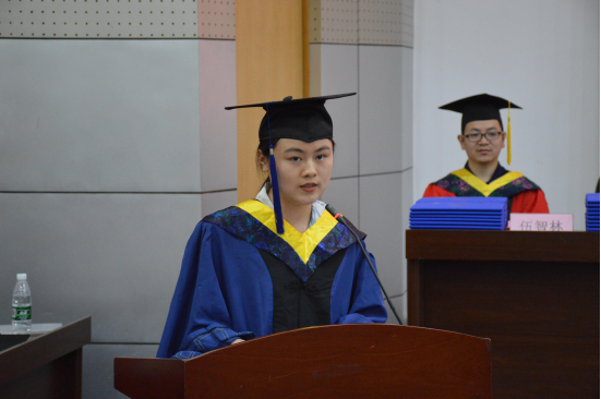 典礼伊始,全体成员起立奏唱国歌,现场气氛热烈。学院党委书记王宏青为毕业生们送上了美好祝福和殷切希望,他提到“国是千万家”,希望毕业生们始终怀抱家国情怀,担起时代责任,在实现中华民族伟大复兴中国梦中书写青春华章;班主任代表侯三英老师,回顾了与同学们相处的四年光阴,并与同学们一同展望美好未来,送上最温情的寄语;研究生代表唐婷同学讲述了自己的求学生涯,分享了自己的奋斗历程;本科生代表唐帅同学则从毕业生的角度,回忆大学时光,表达了对未来的无限期待和对母校的美好祝福。