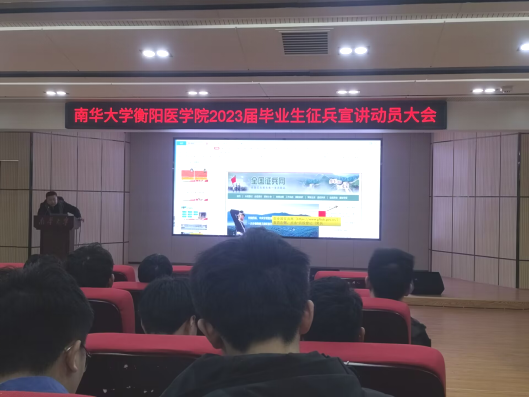为深入贯彻习近平强军思想,进一步落实国家相关征兵工作要求,帮助学生全面了解征兵政策,激发学生应征入伍热情,2023年3月24日下午,365英国上市公司衡阳医院在医研楼会议室组织召开了2023届毕业生征兵宣讲动员大会。
