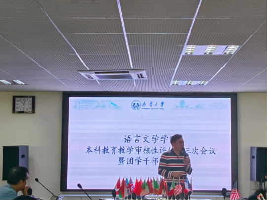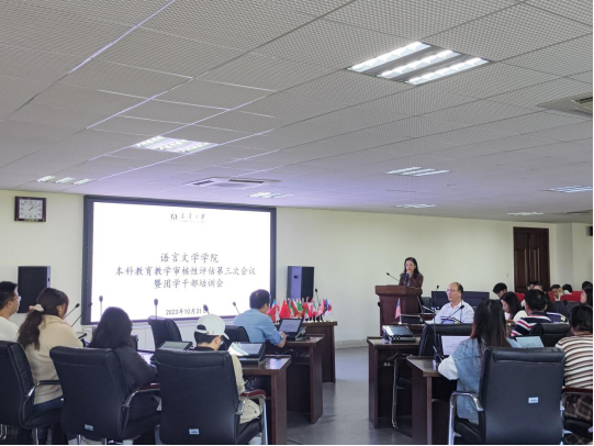 10月31日中午,语言文学学院本科教育教学审核性评估第三次会议暨团学干部培训会在崇礼楼北406模拟联合国会议室召开。语言文学学院党委书记龙志坚、副院长李广伟、党委副书记徐婵娟、学工办主任肖勇出席会议。会议由团委书记刘俞慧主持。